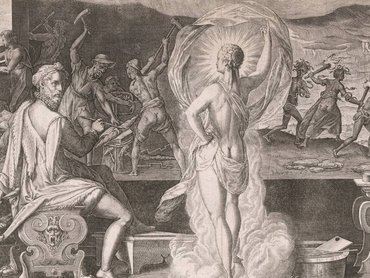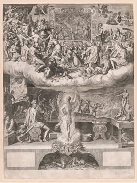 Fölöttük, a felhőkön az olümposzi istenek gyűltek össze, akiket Minerva próbál meggyőzni a festészet fontosságáról.