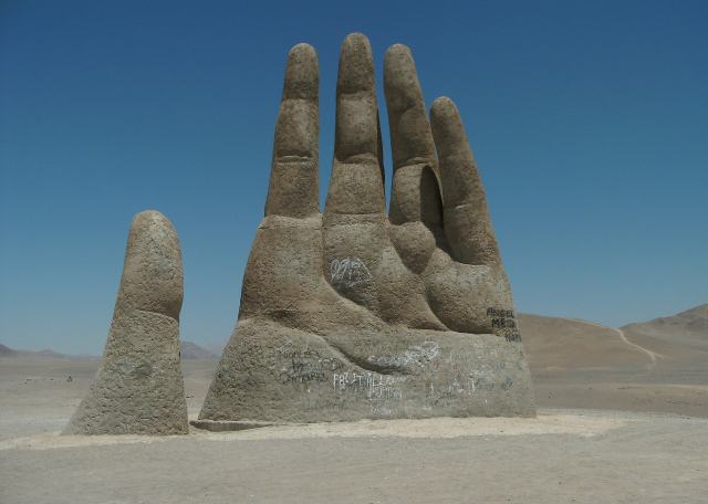 Kétségkívül ez Chile egyik legtöbbet emlegetett installációja, amelyet Mario Irarrázabal chilei szobrász öntött formába még 1992-ben. Az ég felé vágyó, óriási kézfej önmagában is különös a világ egyik legkietlenebb helyén, hát még akkor, ha tudjuk is: a szobor mögött meghúzódó koncepció az emberi magányról, gyötrelemről és küzdésről mesél.