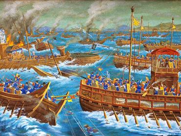Nagyot ugrunk térben és időben is: a 16. századi Koreába. Ekkor szállt szembe 13 hajójával I Szunsin tábornok a japán hódítók mintegy 300 hajót számláló flottájával. A koreai hadvezérnek egyetlen előnye volt: a helyismeret – úgy ismerte a Myeongnyang-szorost, amely elválasztja egymástól a Koreai-félszigetet és a Csin-szigetet, mint a tenyerét. Noha a császár levélben utasította, hogy adja fel pozícióját, és csatlakozzon a szárazföld belsejében a hadsereghez, I Szunsin lehorgonyozta hajóit a szoros északi kijáratánál, és várt. A közelgő japán flotta hatalmas túlerőben volt: több mint 300 hajót számlált, amiből 130 hadihajó volt, a többi csapatszállító. A szűk szorosba azonban az erős áramlás miatt egyszerre csak néhány japán hadihajó tudott behajózni, és azok sem tudtak igazán jól manőverezni a vadul kavargó víz, a zátonyok és a sziklák miatt. Ezzel szemben I Szunsin hajói a szoros kijáratánál kiszélesedő, nyugodt tengerről zavartalanul célozhattak ágyúikkal, egymás után pusztítva el a japán hajókat.