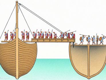A római hadiflotta titkos csodafegyvere a corvus, vagyis „holló” névre hallgató csapóhíd volt – a technológia ötlete a hagyomány szerint Caius Duillius consul fejéből pattant ki, akinek vezetésével a rómaiak Kr. e. 260-ban legyőzték a pun hadiflottát a szicíliai Mylaei (ma Milazzo) partjainál. A corvust a római hajók fedélzetére szerelték, majd az ellenséges hajók mellé navigálva kioldották: a híd nagy erővel rácsapódott a másik járműre, a végén lévő horog (mely a holló görbe csőrére hasonlított, innen kapta nevét a találmány) pedig beakadt, és megakadályozta a két hajó szétcsúszását. A katonák ezután gyalogosan átkeltek a hídon, és kézitusában legyőzték az ellenséges hajó közelharcra nem számító legénységét, rákényszerítve a tengeri hadviselésben jóval jártasabb punokra a szárazföldi hadakozást.