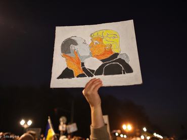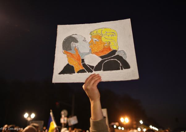 Putyin és Trump új keletű barátságát szimbolizáló plakáttal vonulnak fel az Ukrajna-párti tüntetők