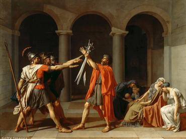 A szoborszerűen ábrázolt, sudár termetű fiatal férfiak előrenyújtott jobb karral esküdnek az apa kezében tartott kardokra – a mozdulat annyira kifejező volt, hogy hamarosan mindenki azt gondolta, a rómaiak tényleg hasonló karlendítéssel szalutáltak egymásnak. A mozdulat népszerűségét mutatja, hogy az újkori olimpiai mozgalom is átvette, a sportolók így üdvözölték egymást (ennek a szokásnak a náci hatalomátvétel vetett véget), a film feltalálását követően pedig az összes római korban játszódó alkotásban láthatták a nézők.