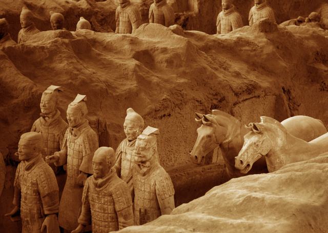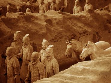 Csin Si Huang-ti például úgy vélte, annyi már csak jár neki, hogy pár ezer katona vigyázza túlvilági létét. Azt gondolhatta, hadd ne érezze már túlzásnak, hogy néhány száz ló, tucatnyi szekér, parasztok csapatai, pár zenész, akrobata, néhány erőművész és tisztviselő hivatalnok, no meg kevéske ágyas gondoskodjon elfogadható hangulatáról az örökkévalóságban. Azt tartotta, amikor ezek majd mind életre kelnek halála után, akkor talán elegen lesznek ahhoz, hogy elviselhetővé tegyék létét. Beérte ehhez mindössze 8000 katonával, mintegy 520 lóval, másfél száz lovassal és még annál is kevesebb terrakotta szekérrel.