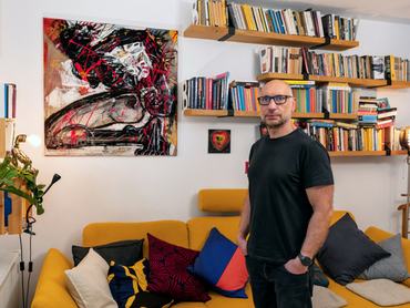 Otthon még több van, nézd, megmutatom, vannak róla fotóim! Ez egy Menyus-kép (Menyhárt Tamás Menyus képzőművész – a szerk.), ami egy nagy ágytámlára van festve. Ez egy Ada Vilhan-kép a konyhában, ezt kapta a feleségem karácsonyra, gyönyörű képeket készít. Ez egy feLugossy (Munkácsy-díjas magyar festő, performer, színész, rendező, író, forgatókönyvíró, énekes – a szerk.). Nézd, ez egy Bukta Imre-festmény, a feleségemtől kaptam, és itt a nagy kedvencem, Hencze Tamás. Képzeld, ez meg Verebics Kati képe, most kaptam tőle!