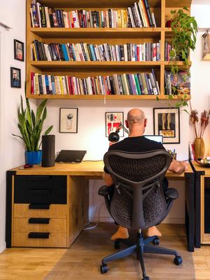 Ha van fél-egy óra szünetem, akkor letolok egy edzést, fekvőtámaszozom meg húzódzkodom. Látod, van itt ilyen henger is, ez arra jó, hogy kiropogtatom a hátam, meg fellógatom magam, a sok ülés után jólesik. Két hónap alatt egyébként mindenféle koplalás nélkül fogytam 6-7 kilót, mert elhagytam a cukrot. Most már inkább csak erősödni szeretnék.