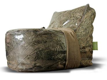 A széna használata a bútorgyártásban nem új keletű, a bútorok belsejét sokáig azzal tömték ki. Az olasz kárpitos, Fabio del Percio pedig visszakanyarodott ehhez a megoldáshoz. Olyan bútorokat készített, melyeket szalmából épített fel, majd átlátszó PVC-vel vont be, amit a cipzár segítségével lehet eltávolítani. Szép és egyszerű.