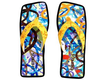 A recept: végy egy hétköznapi flip-flop fazont, és kérj fel egy menő amerikai művészt, például David Palmert, hogy fessen rá valami szép színeset, dobj rá még néhány gramm tizennyolc karátos fair trade öko-aranyat, majd add el 18 ezer dollárért, amit az esőerdők megmentésére költesz el.